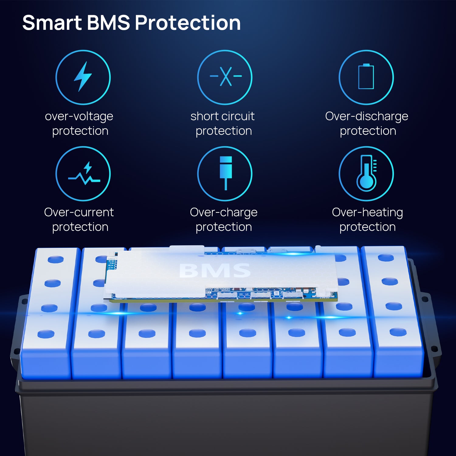 【Intelligent 100A BMS】The stable chemical structure of lithium iron phosphate batteries ensures the safety of lithium iron phosphate batteries. The intelligent 100A BMS protects 48V 100Ah Lifepo4 batteries from the most common causes of battery failure, temperature fluctuations, earthing faults, overcharging, over-discharging, overcurrent and short circuits. (Peak current 300A ≤ 5S / 500A ≤ 1S)