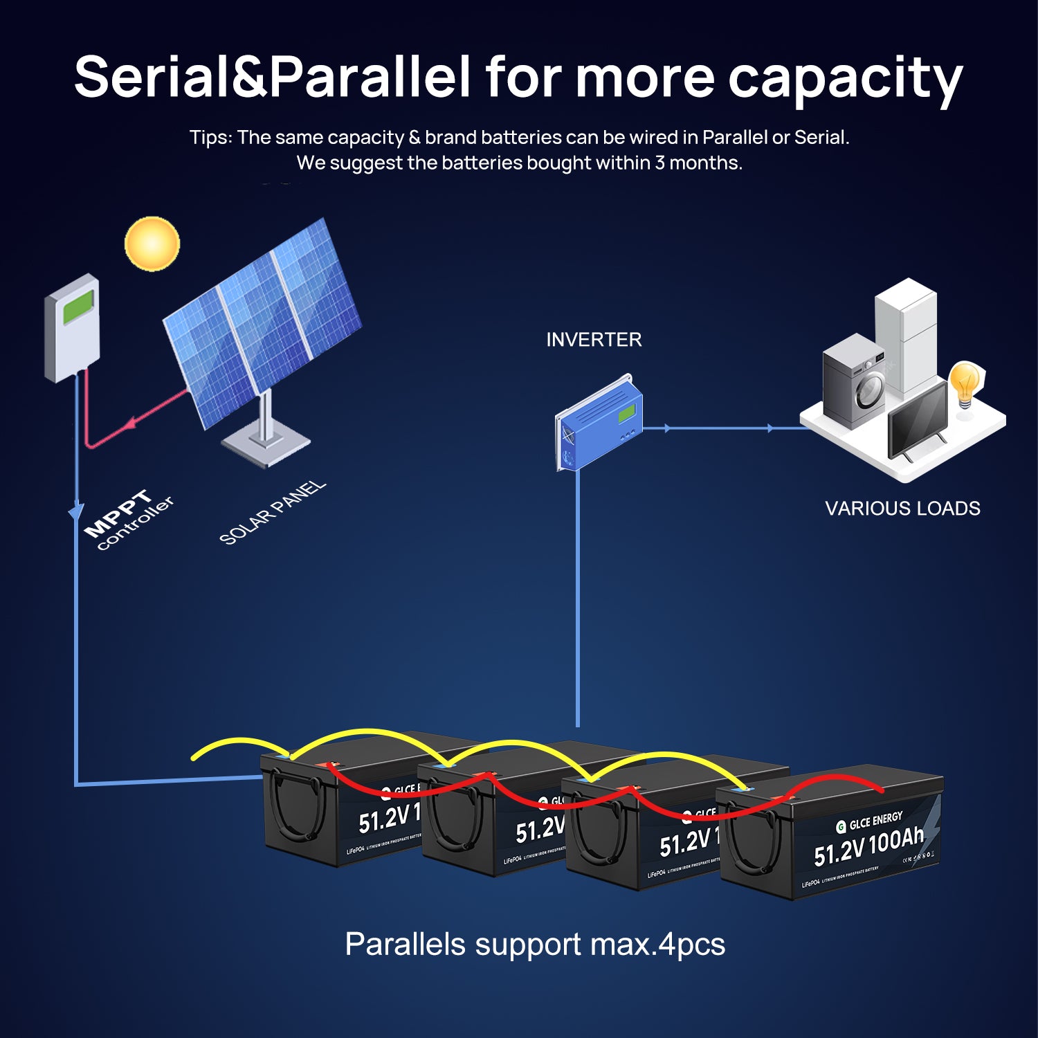 【Advanced Technology】GLCE ENERGY 48V 100Ah LiFePO4 battery made of class A cell, safe, non-toxic, renewable energy. Compared to sealed lead-acid batteries, lithium LiFePO4 batteries are lightweight, compact, have longer life, higher energy density, more safety and cost-effective advantages.