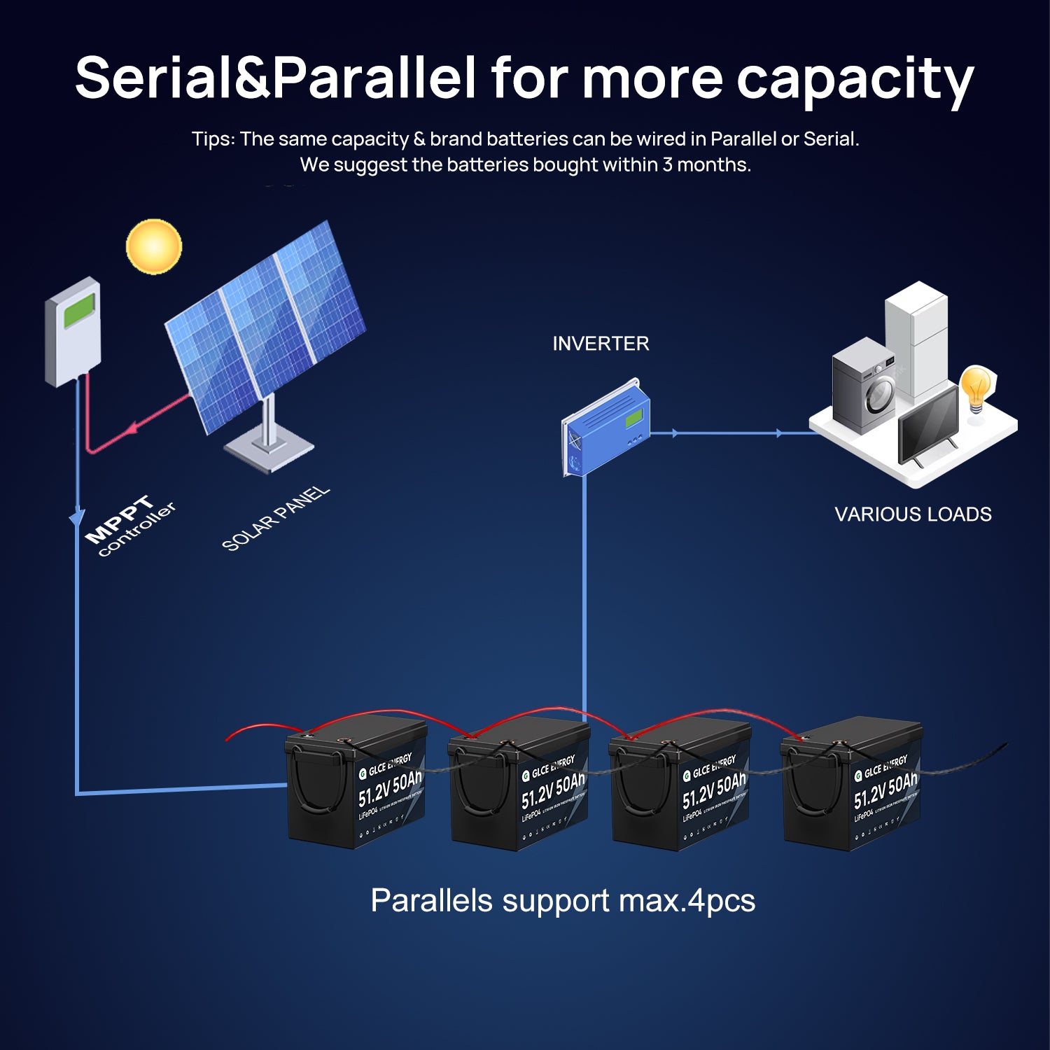 - ADVANCED TECHNOLOGY - GLCE ENERGY mini version 48V 50Ah Grade A LiFePO4 battery, safe, non-toxic, renewable energy. Compared with sealed lead-acid battery, lithium LiFePO4 are lightweight, compact size, longer service life, higher energy density, more safety and cost-effective benefits.