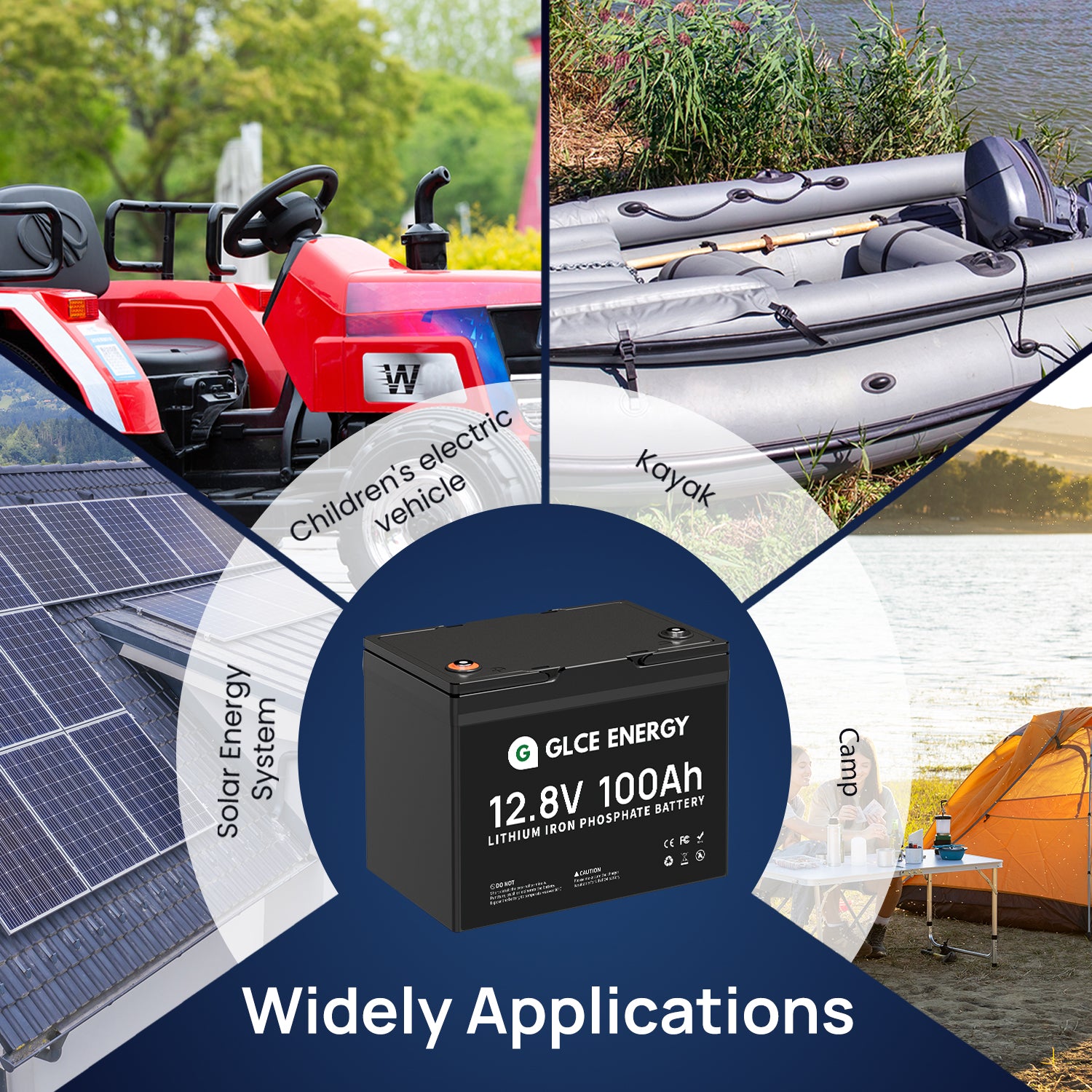 - 【Built-in intelligent BMS】The intelligent BMS of GLCE ENERGY protects your 12.8V lifepo4 battery 100Ah from the most common causes of battery failure, such as temperature fluctuation, ground fault, overcharge, over discharge, over current and short circuit.