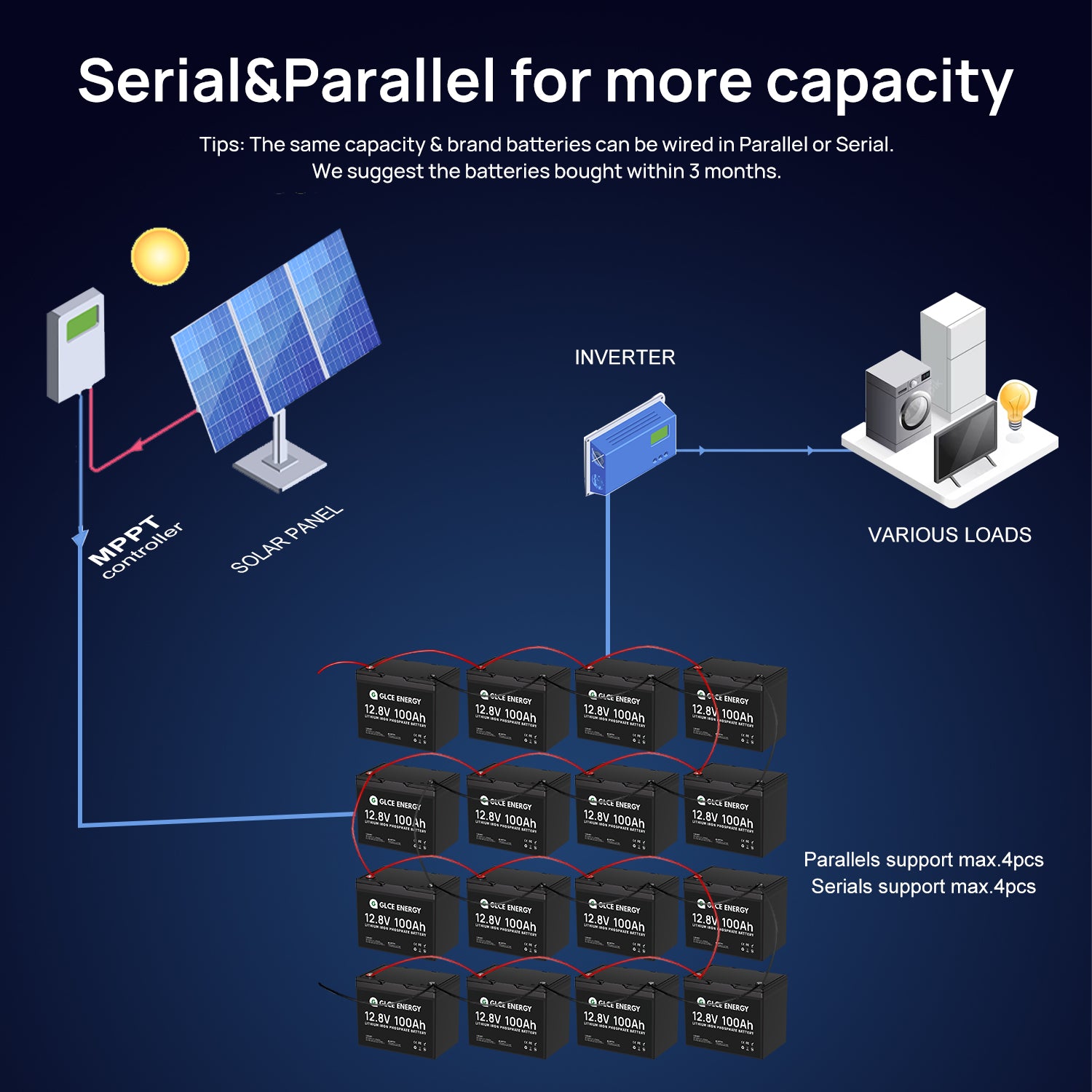 - 【Advanced Technology】Mini version GLCE ENERGY 12V 100Ah LiFePO4 battery made of grade A cells, safe, non-toxic, renewable energy. Compared with sealed lead-acid battery, lithium LiFePO4 are lightweight, compact size, longer cycle life, higher energy density, more safety and cost-effective advantages.